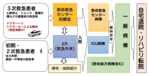 重症内因性疾患によるショックや急性心筋梗塞や脳卒中、重度の多発外傷・熱傷などの初期及び二次救急医療機関では対応が難しい重症及び複数の診療科領域に渡る重篤な救急患者を24時間体制で受け入れる三次救急医療施設です。