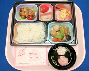 お誕生日:ご入院中に誕生日を迎えられた患者さんには、当日の夕食時にお誕生日カードとケーキをお出ししています。