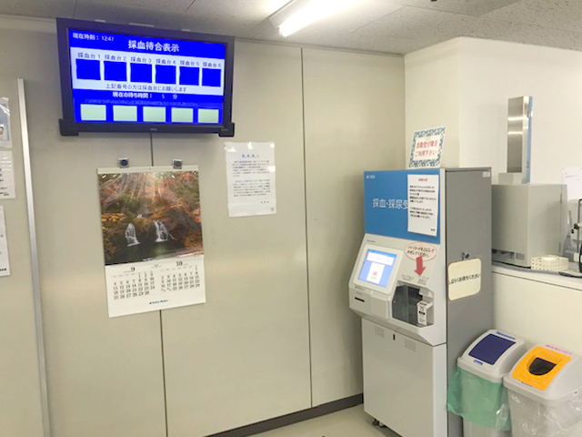 採血業務アシストソリューションを使用することで、患者さんの待ち時間短縮と採血管の認証、患者さんの取り違え事故防止等の安全対策を実施しています。外待ち、中待ちモニターの設置、現在の待ち時間の表示、音声案内でスムーズにご案内できる様になっています。