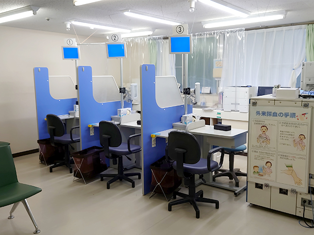 採血室には一日約300人前後の外来患者さんが来院します。診察前検査の患者さんに対応するため、8:00~9:00までは6基の採血台で行っています。ブース形式の昇降採血台を用いることで、車椅子等の患者さんの安全性やプライバシー保護に対応しています。
