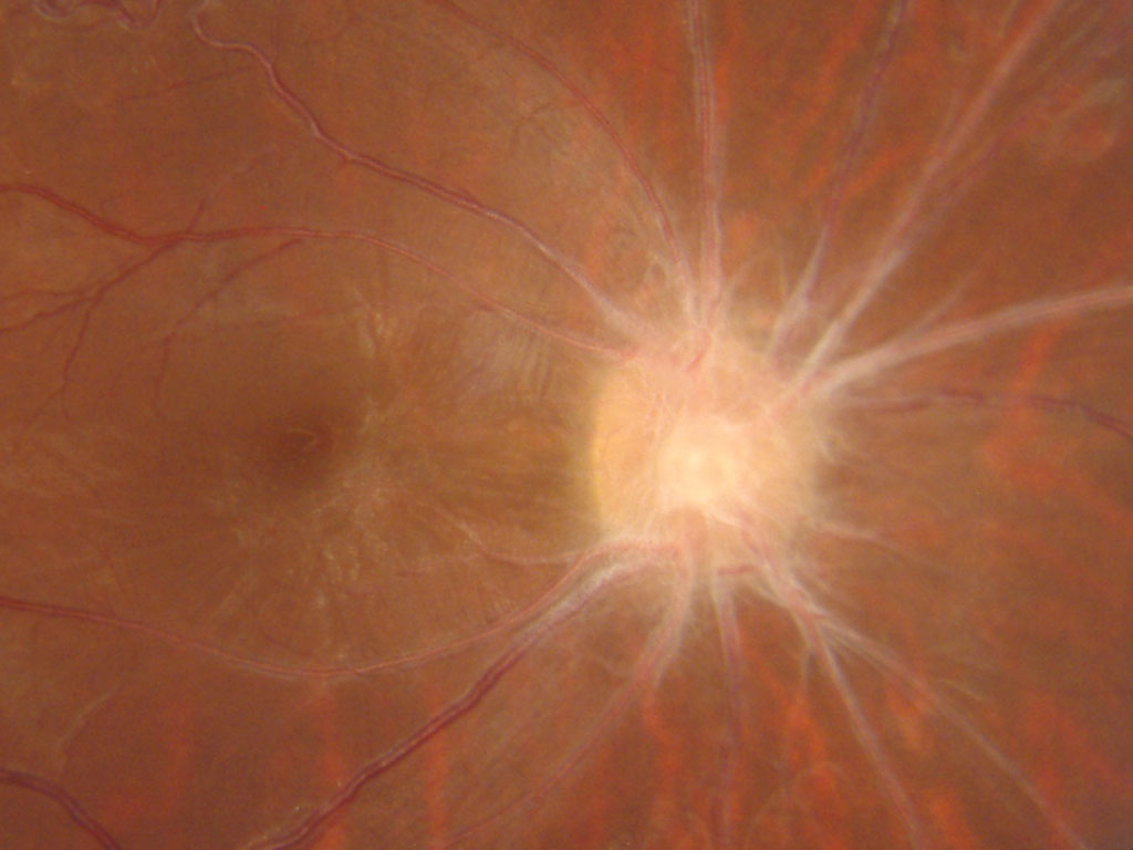 Bergmeister乳頭(胎生期乳頭部の硝子体動脈とその周りを固めるグリアの集合)の名残り.薄い膜状所見は目撃が多い.