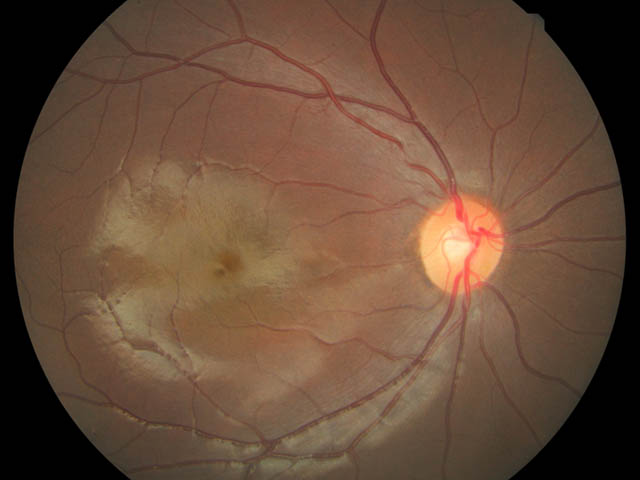 (画像は炒り卵期 scramble-egg stage と思われる → 眼底写真にカーソルを重ねると偽蓄膿状態が出ます)