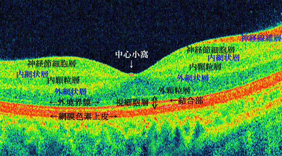 黄斑部,特に中心窩は視細胞のみ(神経上皮層),ということで,構成要素を網膜10層 でいうと内境界膜,外網状層,外顆粒層,外境界膜,視細胞層,網膜色素上皮層である.