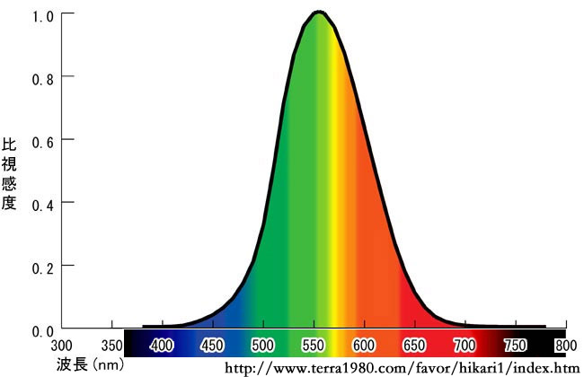 光度,すなわちあかるさの感覚は,波長(または色)によって変わる.これを視感度という.比視感度 spectral luminous efficiency は,最高感度を1