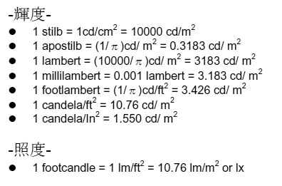 輝度の基本単位は,単位面積あたりの光度で[cd/m2]という単位を用い,これが nt(ニト)である.光っているものを完全拡散面と見なす時,輝度に π の補正を加えてアポスチルブ[asb](もしくはラドルクス)として照度(ルクス)と換算しやすい値にできる.