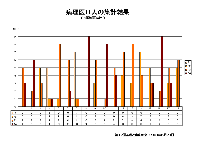 その結果を第13回で開示して討論を行った。棒グラフはその診断結果(11名の病理医のみ)である。