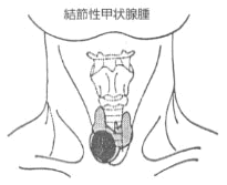 | 甲状腺の中にできる腫瘤です。甲状腺自身が「しこり」になったもので,良性と悪性があります。普通,甲状腺ホルモンの量は正常です。 |