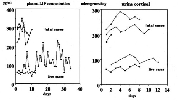 【方法】 対象はBSA 35% 以上の,8例であり,うち6歳以下の小児は3例であった.血漿LIFはradioimmunoassay (RIA) のcompetitive binding assay法であり検体は2回検定し,感度は50 pg/mlであった.また、蓄尿中のコルチゾールも測定した。(BML社, range 38.7-174 microgram/day) 【結果】 小児例3例では,いずれも病悩期全般で,LIFは検出されなかった.死亡3例では受傷初期より,LIF値は高値をとり,最大350 pg/mlであった.救命し得た成人2例では,初期には軽度上昇を認めるにとどまり,経過中一時上昇したものの病状の回復と共にLIF値は下降した.