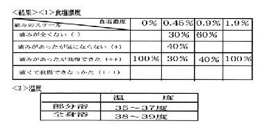 【結論】 I温浴療法時における温水の食塩濃度は、生理的食塩水濃度である0.9%において最も疼痛が緩和されていることが解った。 |